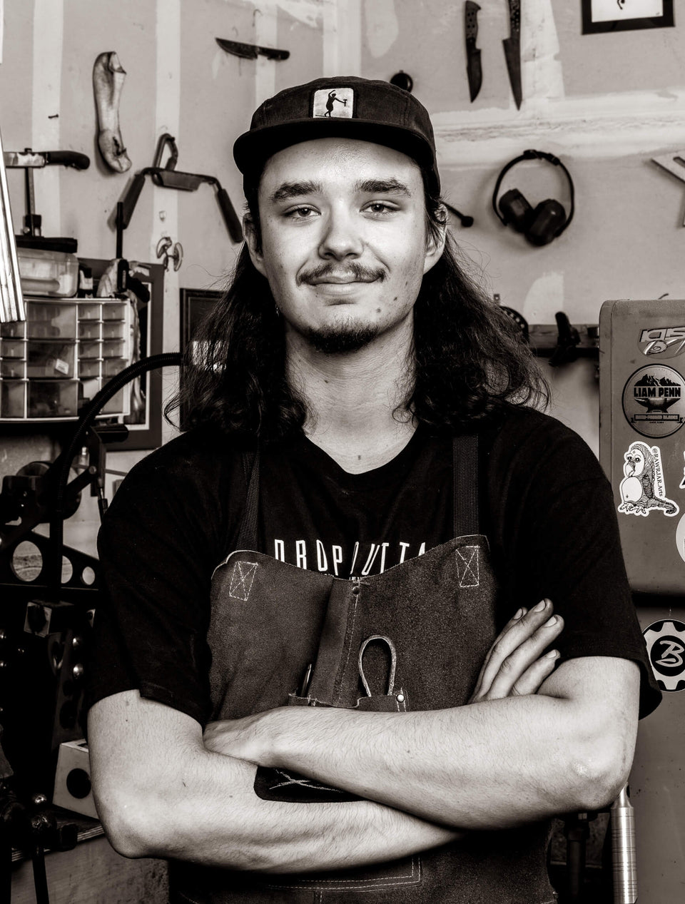 Since childhood Jayden has been captivated by the way the world around him works. Deconstructing, modifying, experimenting, and constructing objects is in his DNA. Before moving to the metal arts of welding, fabrication, and blacksmithing, Jayden built high-powered lasers from scrap parts. At the age of 10, Jayden and his father took a welding class, and the spark was lit. They immediately purchased a MIG welder for the home garage, and Jayden embarked on a new journey that quickly transitioned from hobby to a source of income. Learning in solitude, as well as from a local ornamental blacksmith named David Norrie, Jayden spent several years taking welding jobs, and we’re glad he did, because the money he earned allowed him to transition to full-time knifemaking.