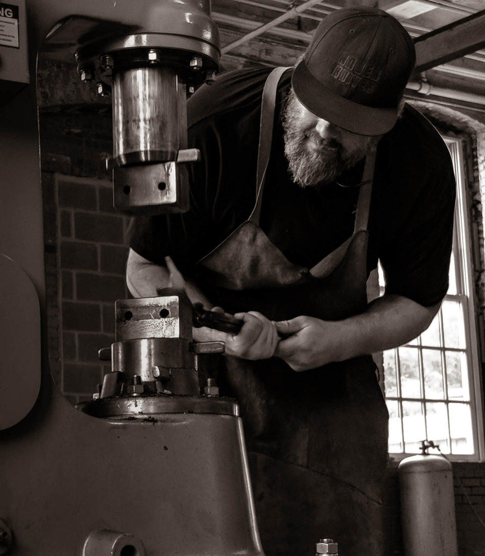 Nick Anger creates renowned precision-forged chef knives at his shop in northern Vermont. Often employing his own custom damascus, whether formed from folded and twisted carbon steel bars or from ball bearings and powder steel, Nick is continually experimenting and pushing the boundaries of metallurgy in relation to high-performance kitchen knife blades. The forging process itself, followed by his heat treatment, quench, and tempering is done in a tightly controlled multi-step process honed for the steels he makes and uses. From the smallest paring knife to his gorgeous boning knives and the largest full-size chef blades, integral construction is Nick's preferred configuration, with recognizable and remarkably elegant curves and angles defining the bolster where the blade meets the handle and providing a unique aesthetic element that speaks to his eye for captivating three-dimensional forms.