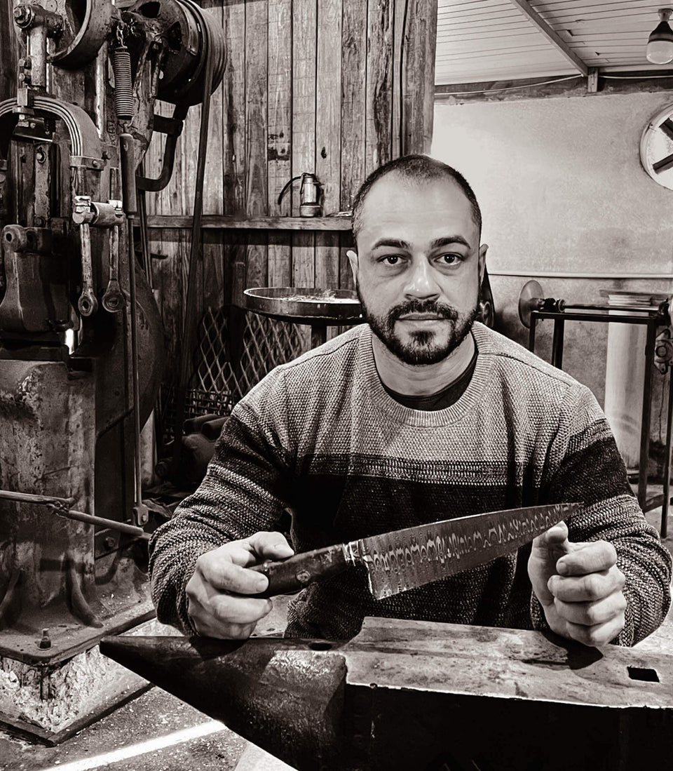 A decade ago, Brazilian artist William Porto was a hobbyist blacksmith, learning the craft and tackling small jobs for local customers. During the day he worked with his father in a neighborhood grocery store, hunted, and provided food for his neighbors. William encountered a skinning knife design, perfect for his daily work, and attempted to recreate it at his forge, his first foray into knifemaking. His interest was piqued, and the possibility of a new career doing what he loved pushed him to pursue bladesmithing full time. Taking courses and forging full time, William crafted his first chef's knife in 2017 at the request of a customer and has not looked back. That first knife won him Best Damascus Knife from the local blacksmith's association, and his second culinary knife went on to win Best Kitchen Knife six months later.